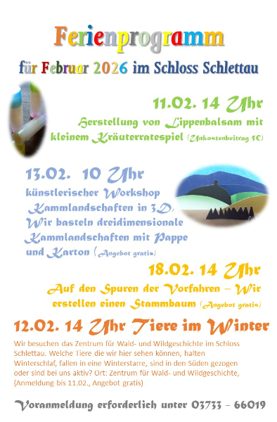 11.02. 14 Uhr Herstellung von Lippenbalsam mit kleinem Kräuterratespiel (Unkostenbeitrag 5€); 13.02. 10 Uhr künstlerischer Workshop Kammlandschaften in 3D, Wir basteln dreidimensionale Kammlandschaften mit Pappe und Karton (Angebot gratis); 18.02. 14 Uhr Auf den Spuren der Vorfahren – Wir erstellen einen Stammbaum (Angebot gratis); 12.02. 14 Uhr Tiere im Winter; Wir besuchen das Zentrum für Wald- und Wildgeschichte im Schloss Schlettau. Welche Tiere die wir hier sehen können, halten Winterschlaf, fallen in eine Winterstarre, sind in den Süden gezogen oder sind bei uns aktiv? Ort: Zentrum für Wald- und Wildgeschichte, (Anmeldung bis 11.02., Angebot gratis), Voranmeldung erforderlich unter 03733 - 66019