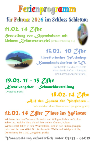 Wir besuchen das Zentrum für Wald- und Wildgeschichte im Schloss Schlettau. Welche Tiere die wir hier sehen können, halten Winterschlaf, fallen in eine Winterstarre, sind in den Süden gezogen oder sind bei uns aktiv? Ort: Zentrum für Wald- und Wildgeschichte, (Anmeldung bis 11.02., Angebot gratis),